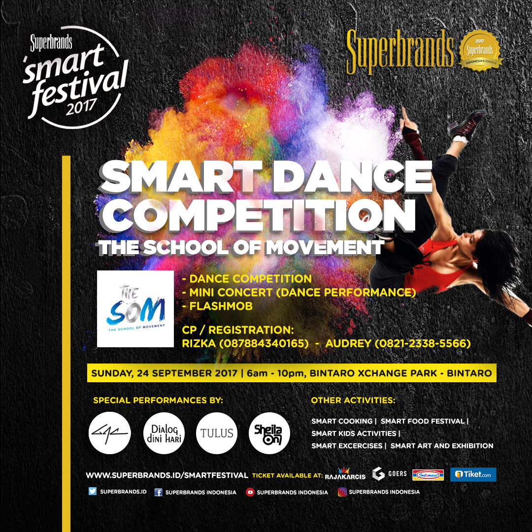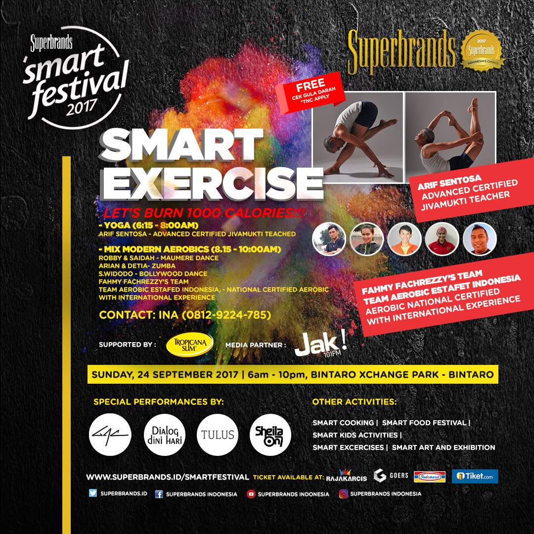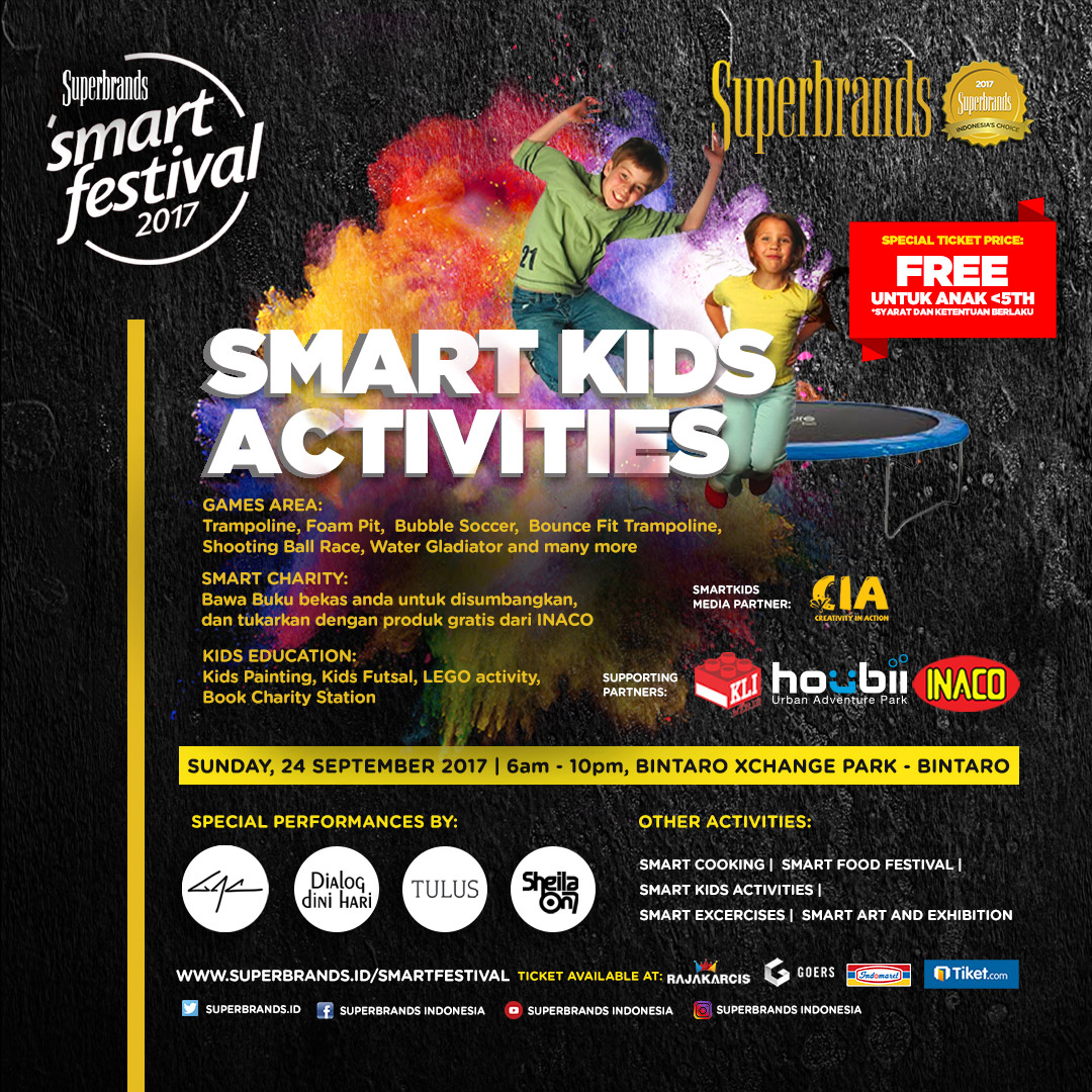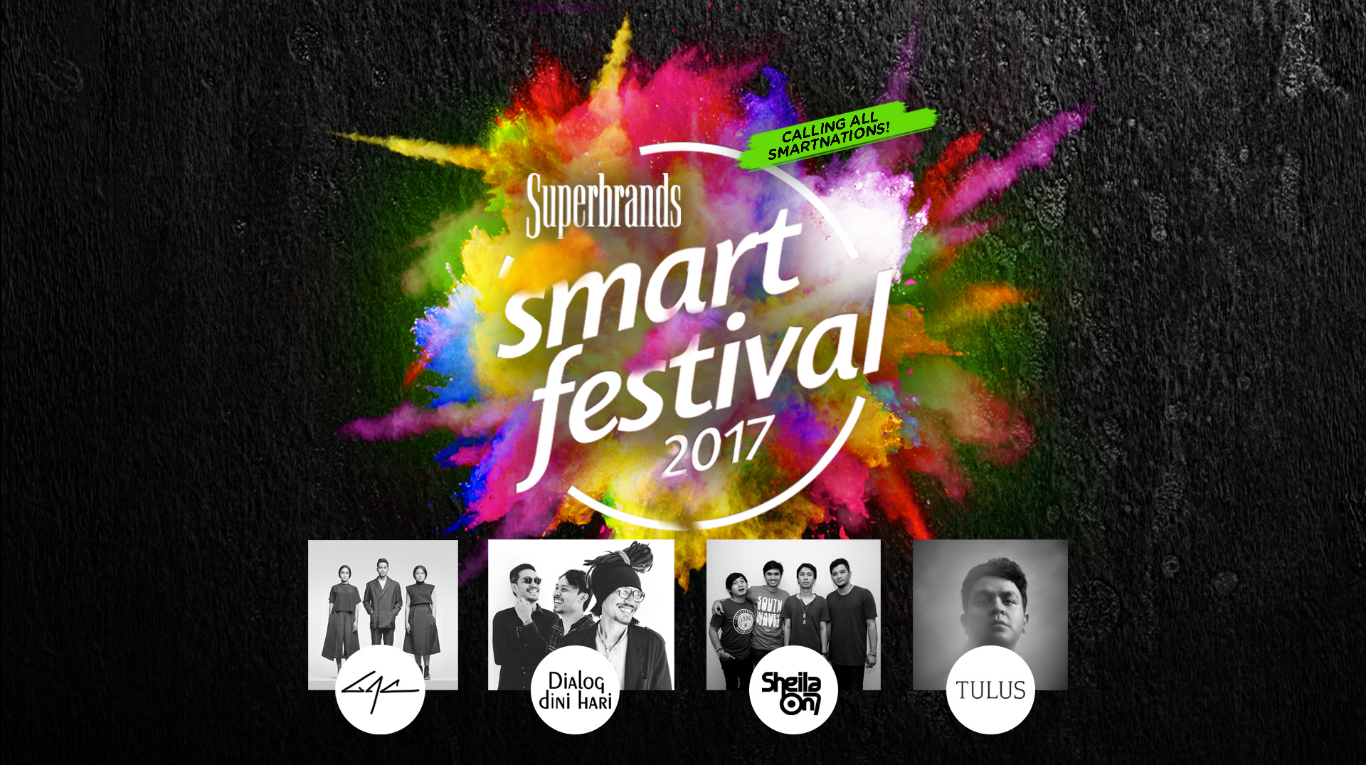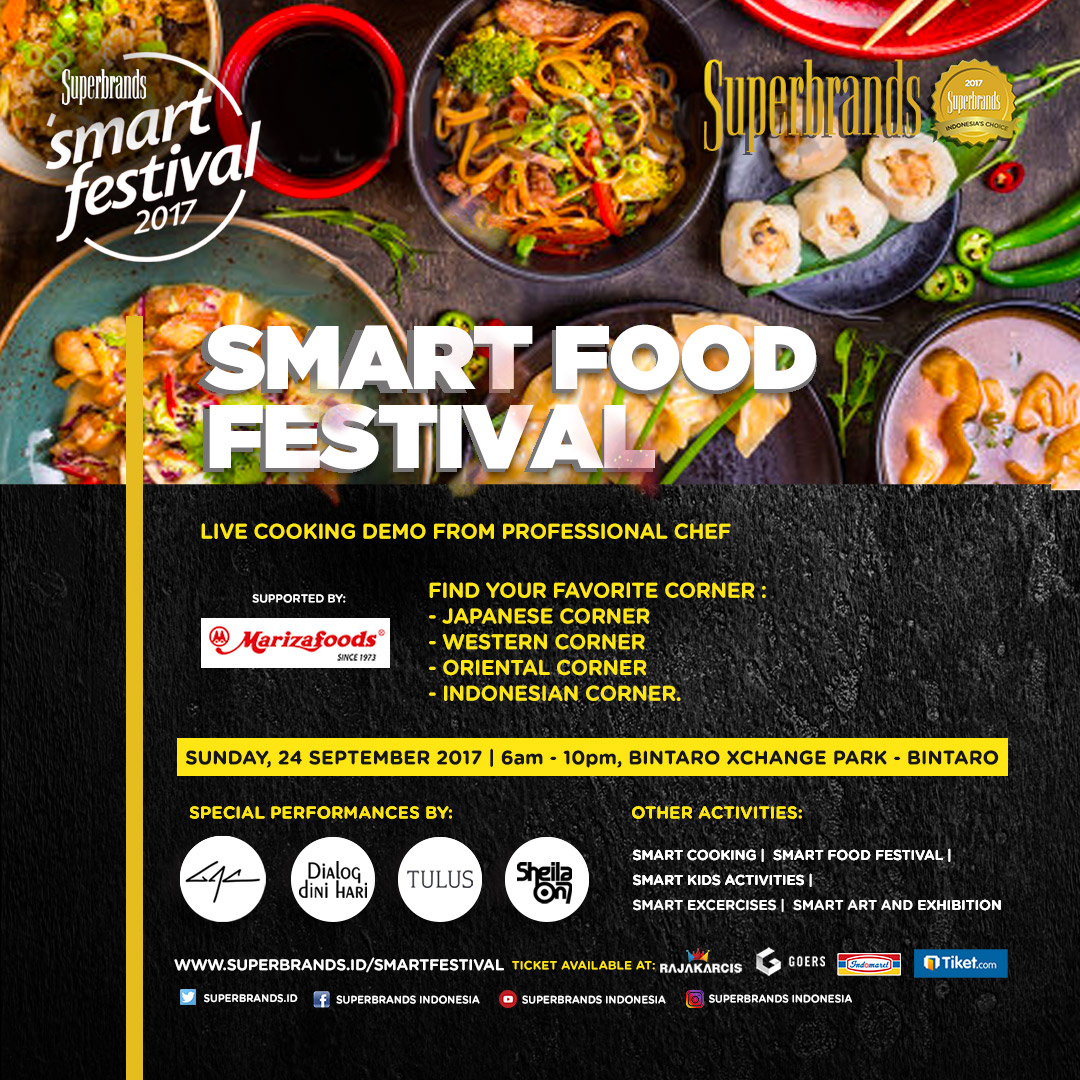 Superbrands Smartfestival 2017 adalah event persembahan Superbrands Indonesia yang akan menjadi wadah bagi para Brand, komunitas, entertainer, dan konsumen untuk saling memberikan inspirasi satu sama lain, satu hari penuh. Dimulai dari Smart Exercise di pagi hari bagi para penggemar olahraga, Smart Cooking class and competition bersama Chef Edwin Law, dan juga Smart Community yang merupakan tempat berkumpulnya para komunitas seperti komunitas fotografi, olahraga, otomotif, dan lain sebagainya. Anda juga akan dimanjakan dengan berbagai macam sajian makanan dari Smart Food Festival. Acara ini dimeriahkan oleh Sheila On 7, Tulus, GAC dan Dialog Dini Hari. Jangan sampai ketinggalan, Minggu 24 September 2017 di Bintaro Xchange Park, Tangerang Selatan mulai pukul 6 pagi!