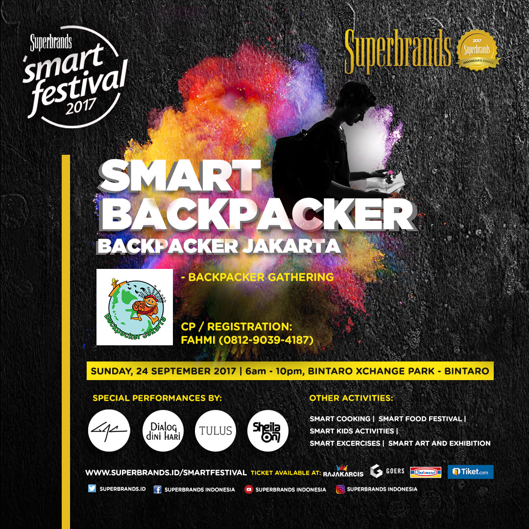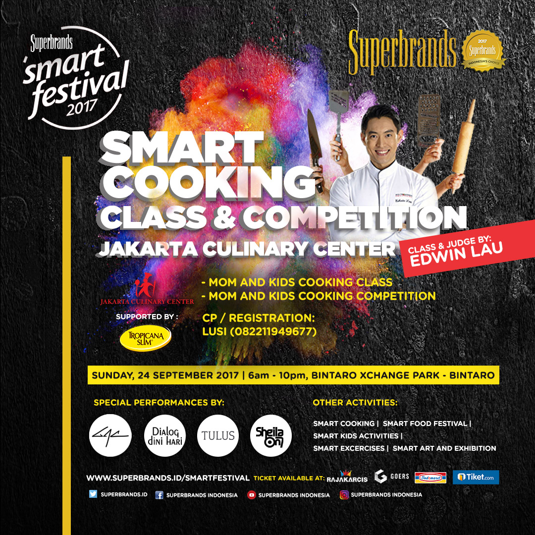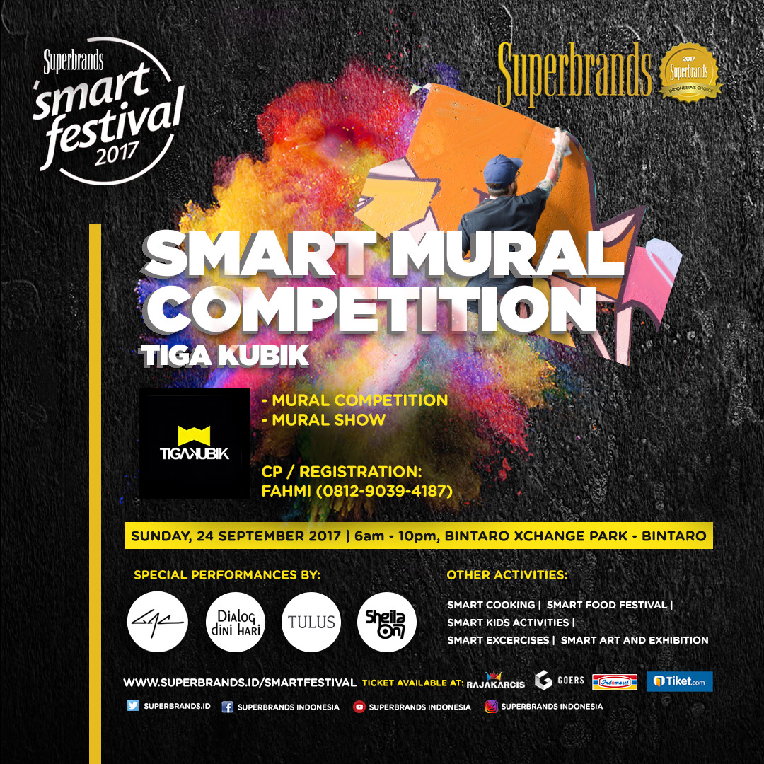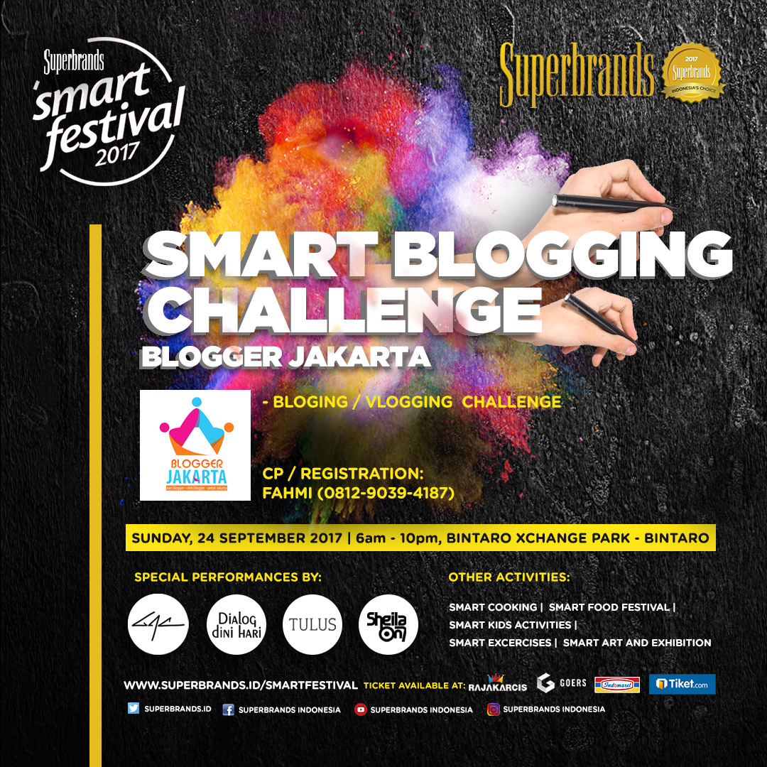 Superbrands Smartfestival 2017 adalah event persembahan Superbrands Indonesia yang akan menjadi wadah bagi para Brand, komunitas, entertainer, dan konsumen untuk saling memberikan inspirasi satu sama lain, satu hari penuh. Dimulai dari Smart Exercise di pagi hari bagi para penggemar olahraga, Smart Cooking class and competition bersama Chef Edwin Law, dan juga Smart Community yang merupakan tempat berkumpulnya para komunitas seperti komunitas fotografi, olahraga, otomotif, dan lain sebagainya. Anda juga akan dimanjakan dengan berbagai macam sajian makanan dari Smart Food Festival. Acara ini dimeriahkan oleh Sheila On 7, Tulus, GAC dan Dialog Dini Hari. Jangan sampai ketinggalan, Minggu 24 September 2017 di Bintaro Xchange Park, Tangerang Selatan mulai pukul 6 pagi!
