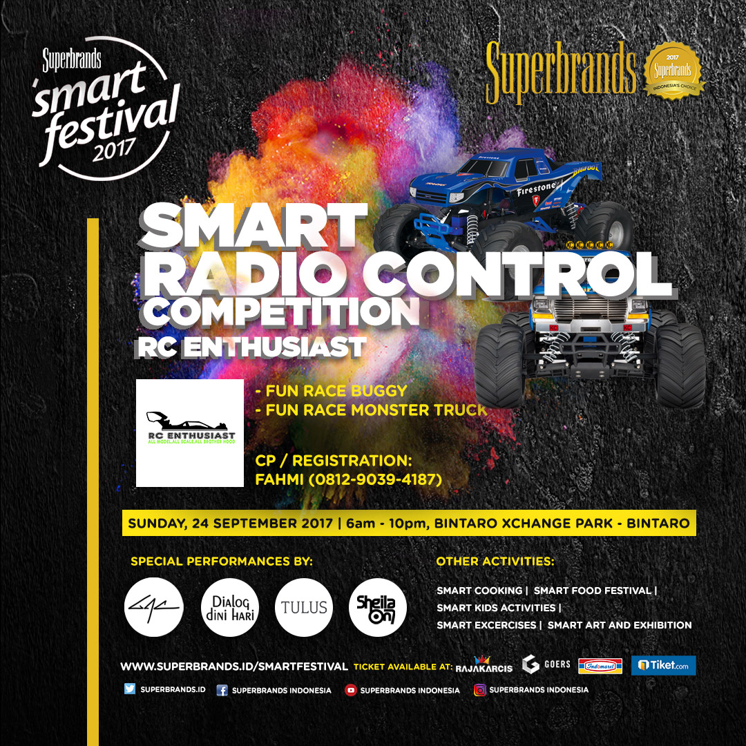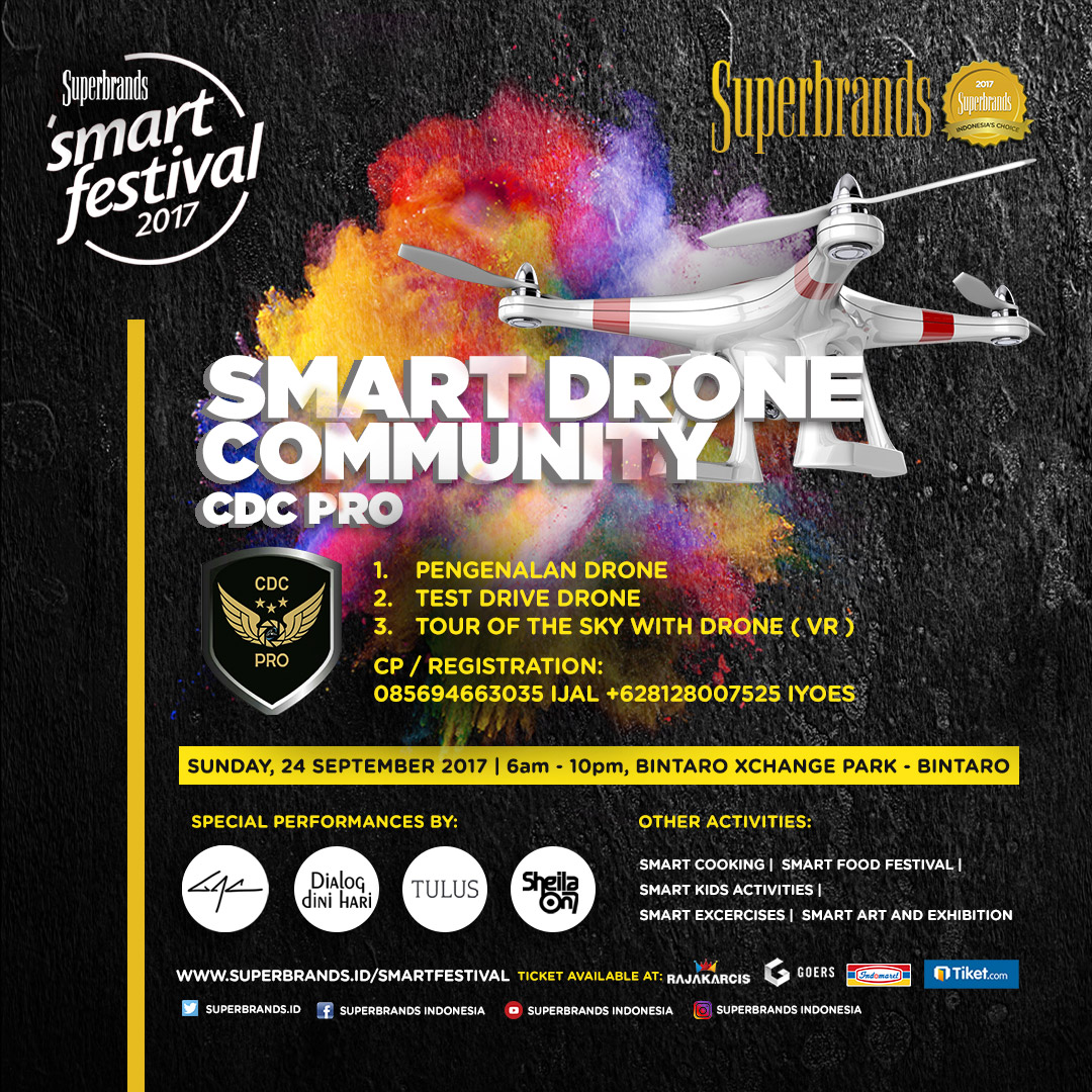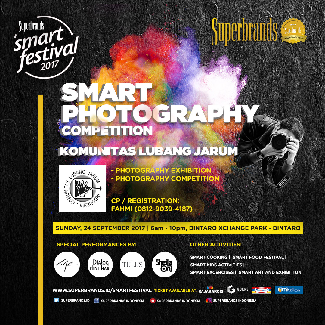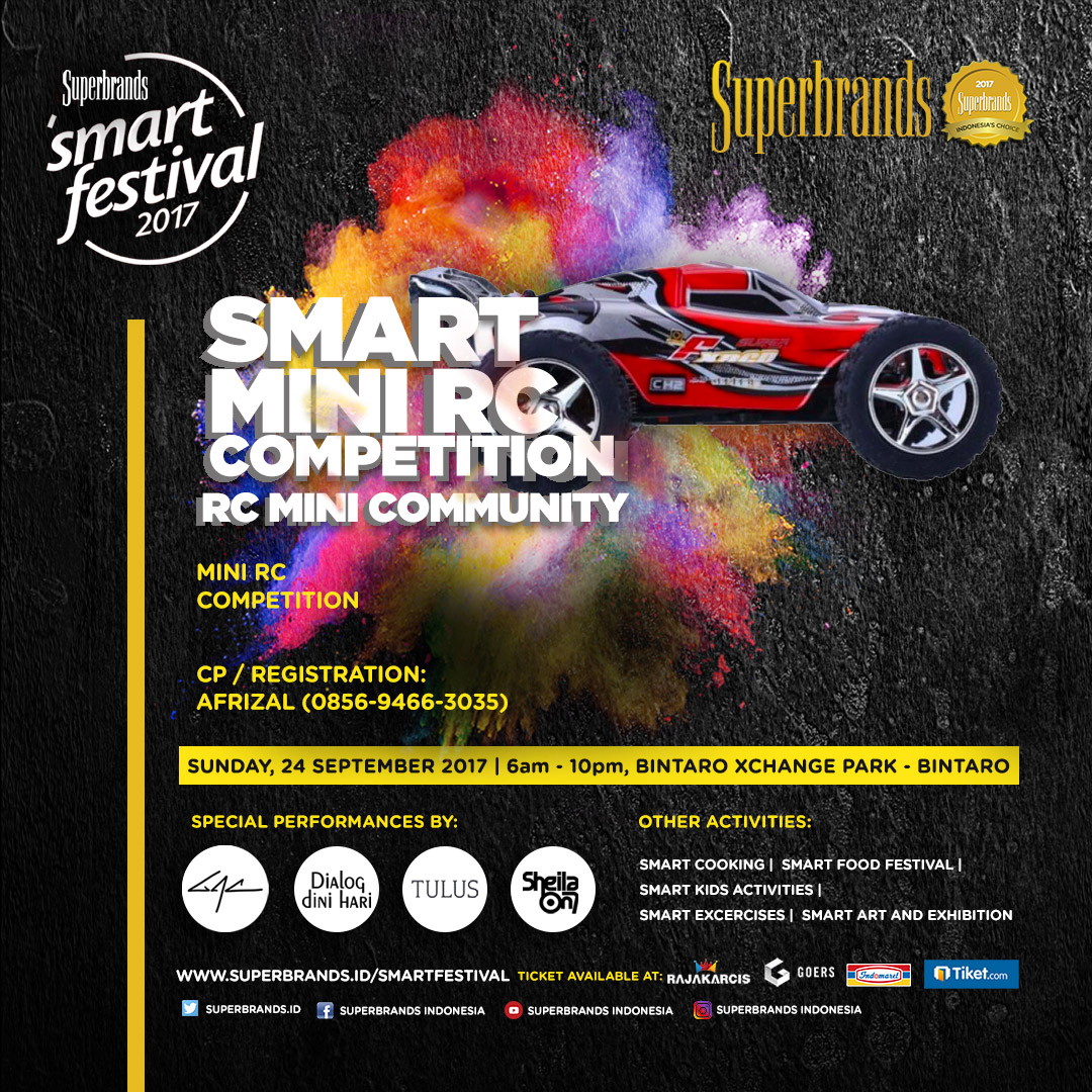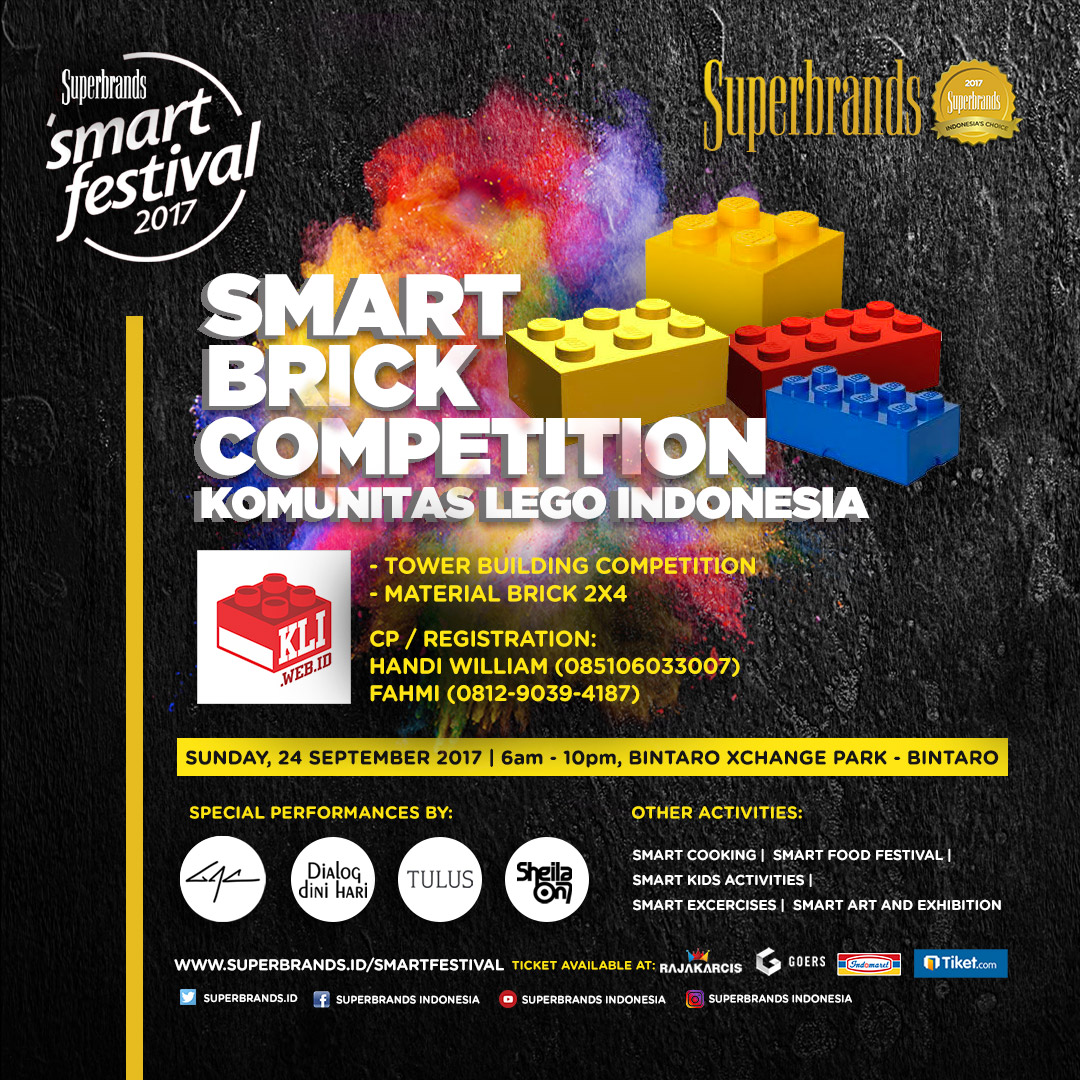 Superbrands Smartfestival 2017 adalah event persembahan Superbrands Indonesia yang akan menjadi wadah bagi para Brand, komunitas, entertainer, dan konsumen untuk saling memberikan inspirasi satu sama lain, satu hari penuh. Dimulai dari Smart Exercise di pagi hari bagi para penggemar olahraga, Smart Cooking class and competition bersama Chef Edwin Law, dan juga Smart Community yang merupakan tempat berkumpulnya para komunitas seperti komunitas fotografi, olahraga, otomotif, dan lain sebagainya. Anda juga akan dimanjakan dengan berbagai macam sajian makanan dari Smart Food Festival. Acara ini dimeriahkan oleh Sheila On 7, Tulus, GAC dan Dialog Dini Hari. Jangan sampai ketinggalan, Minggu 24 September 2017 di Bintaro Xchange Park, Tangerang Selatan mulai pukul 6 pagi!